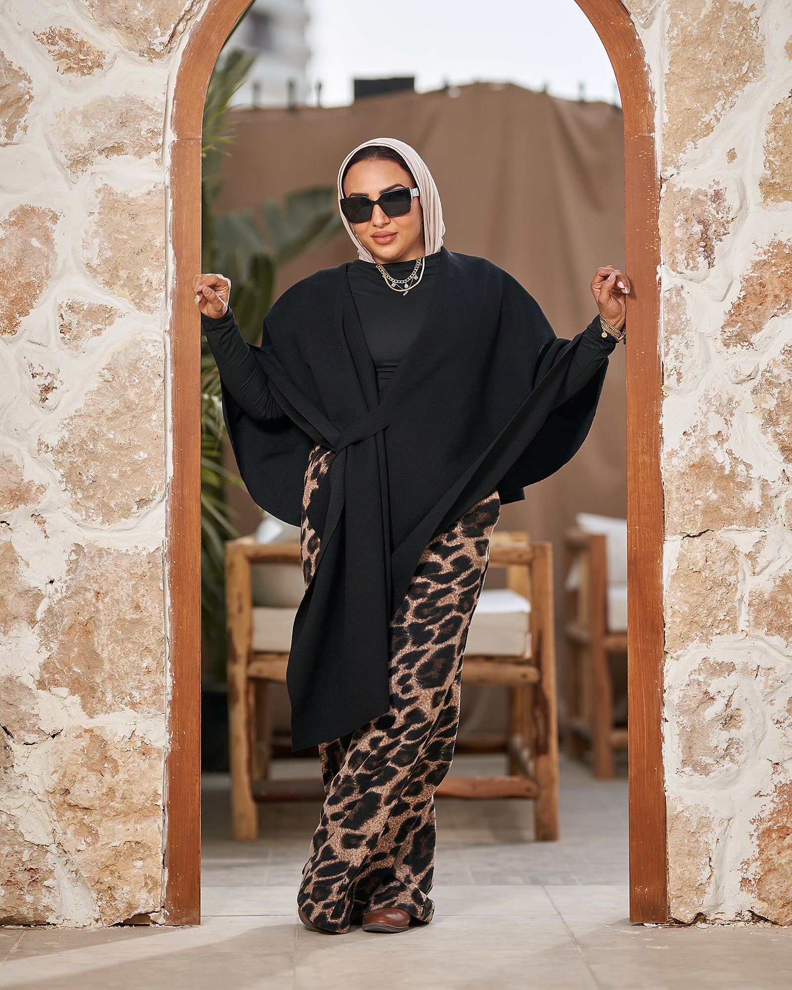 A Tie-Front Cape-Style Wrap Cardigan. This garment is a lightweight, open-front layering. It features a loose, relaxed fit and is characterized by its wide, sleeves and a tie closure at the front.