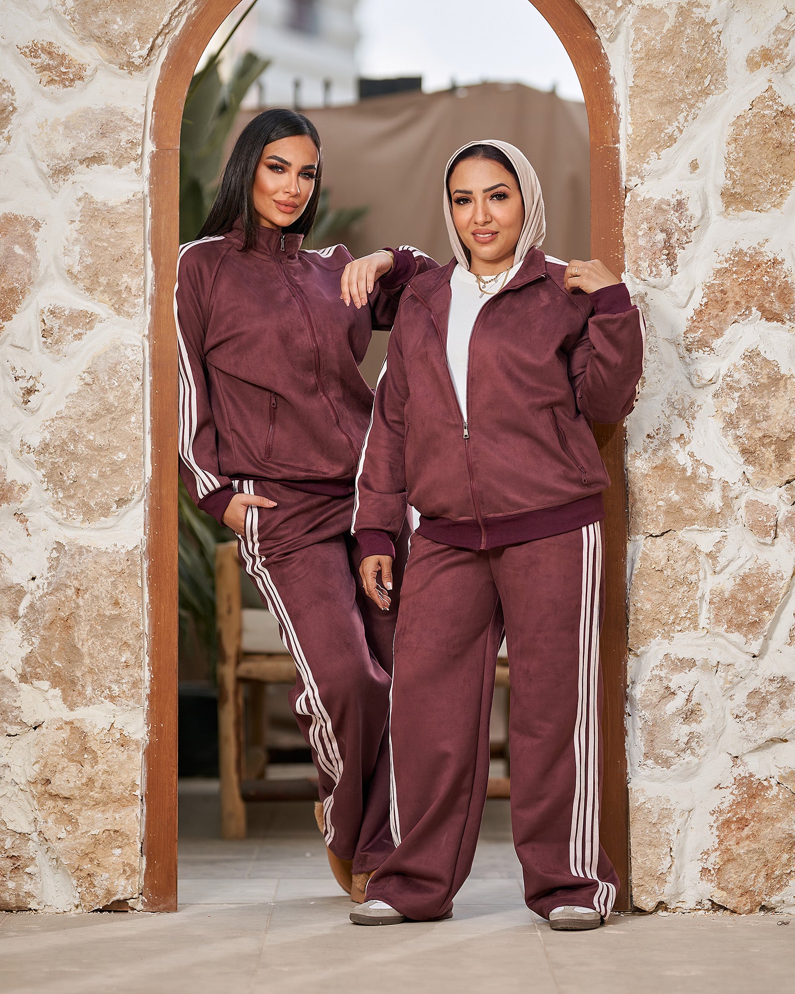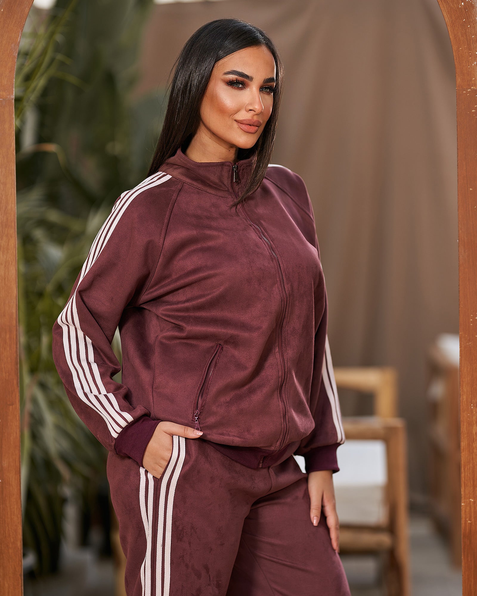A plush, rich-toned suede tracksuit with classic contrast stripes. Ultimate cozy luxury.