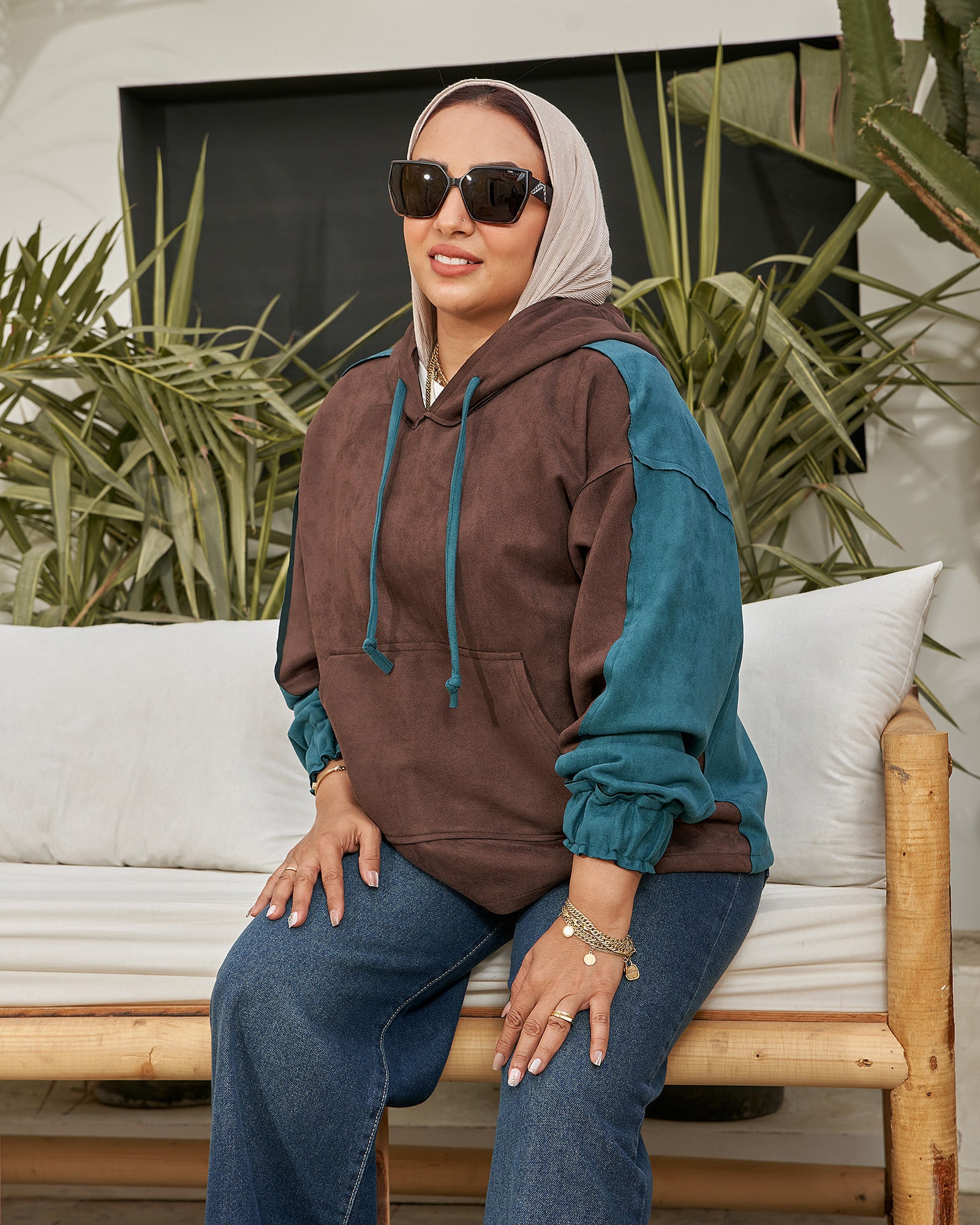 A trendy, color-blocked suede hoodie featuring rich brown and teal panels